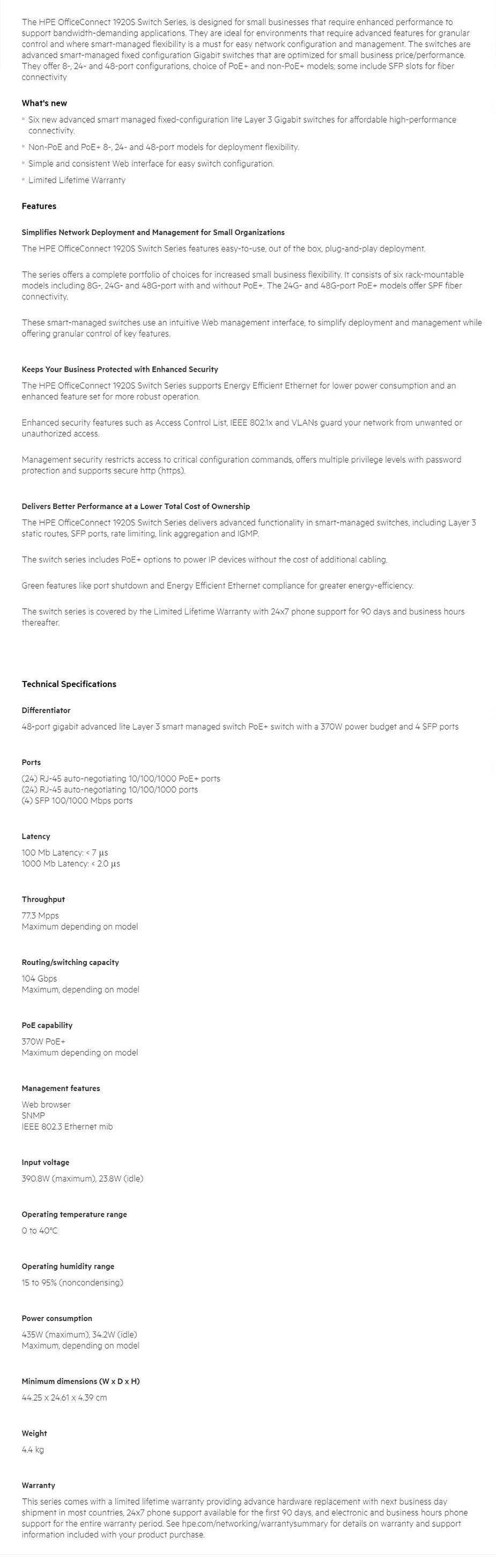 Product Name | HPE OfficeConnect 1920S 48G 4SFP PPoE+ 370W Switch JL386A |