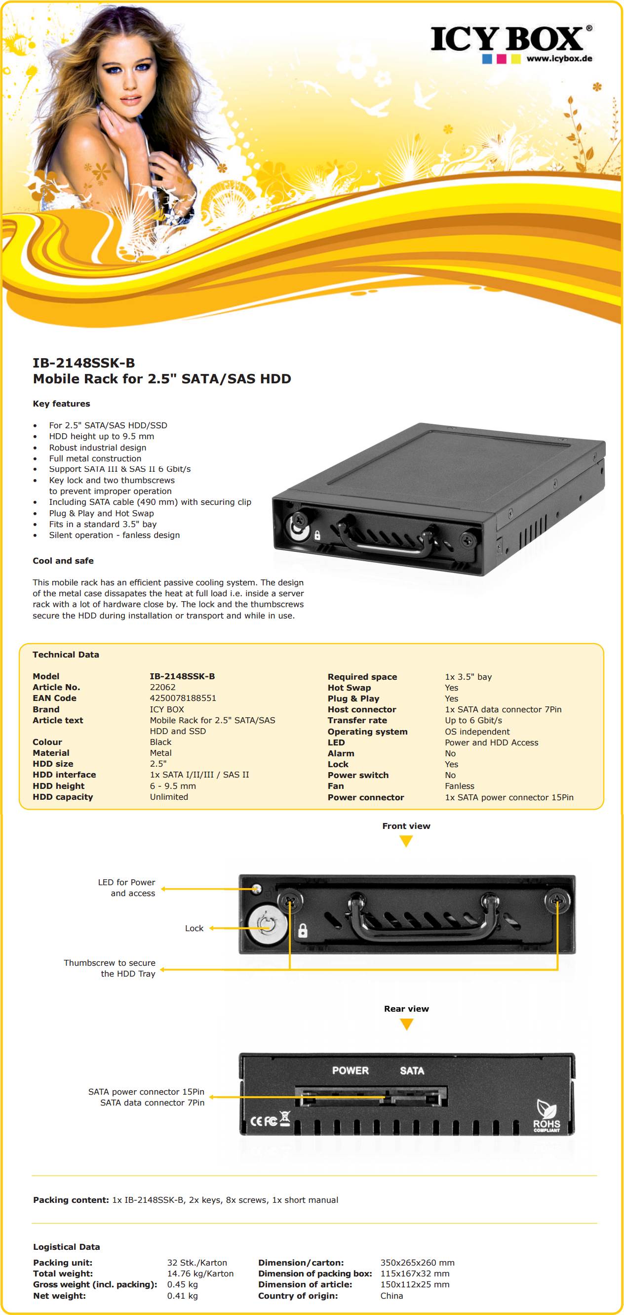 Product Name | ICY BOX IB-2148SSK-B Mobile Rack for 2.5"" SATA/SAS HDD |