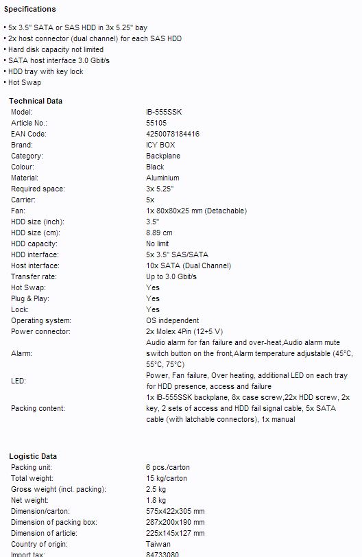 Product Name | ICY BOX- IB-555SSK 5bay Dual Channel SATA/SAS Backplane |
