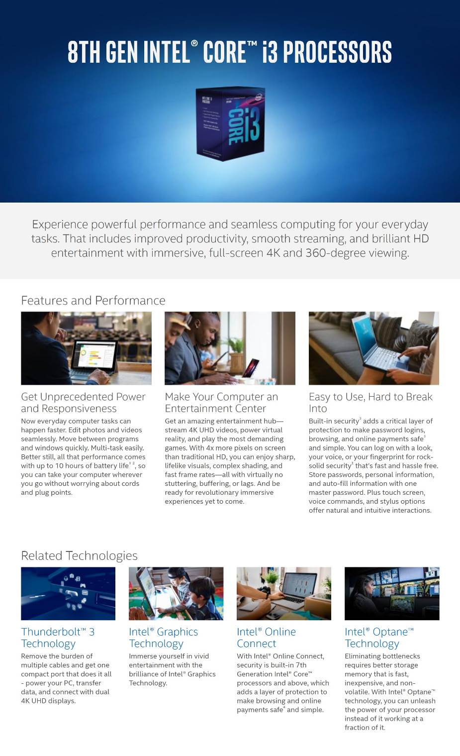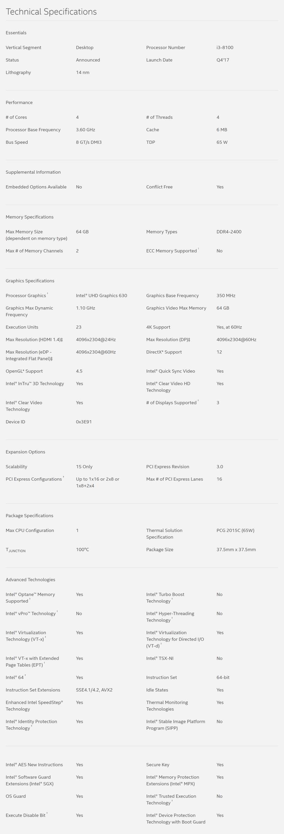 Product Name | Intel Core i3 8100 Coffee Lake Quad Core LGA 1151-2 3.60GHz CPU BX80684I3810 |