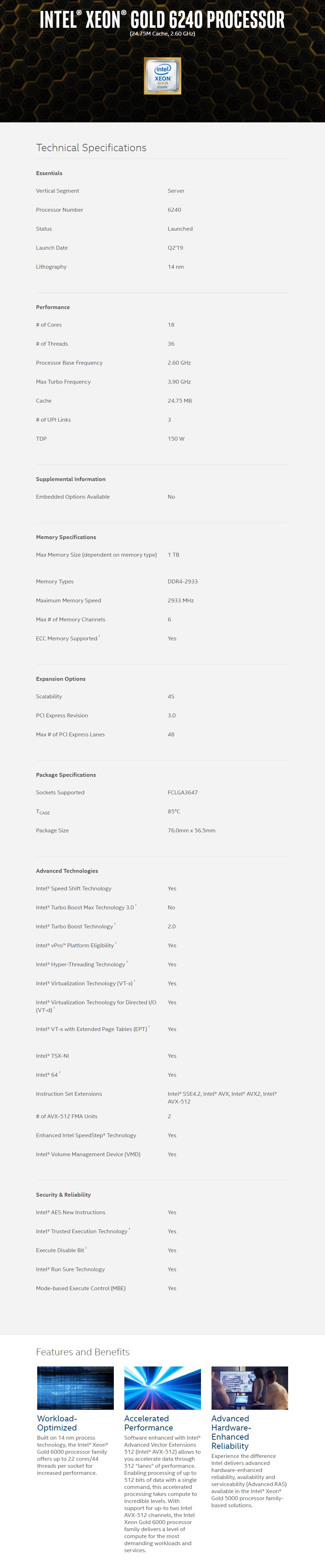 Intel Xeon Gold 6240 LGA3647 2.6GHz 18-core CPU Processor - Frequency: 2.60 GHz (up to 3.90GHz Turbo) - 24.75 MB Cache - Cores: 18 - Threads: 36 - TDP: 150W - Memory Support: DDR4-2933, Max. 1TB, Max. 6 Channels - BX806956240 - 3 Years Limited Warranty