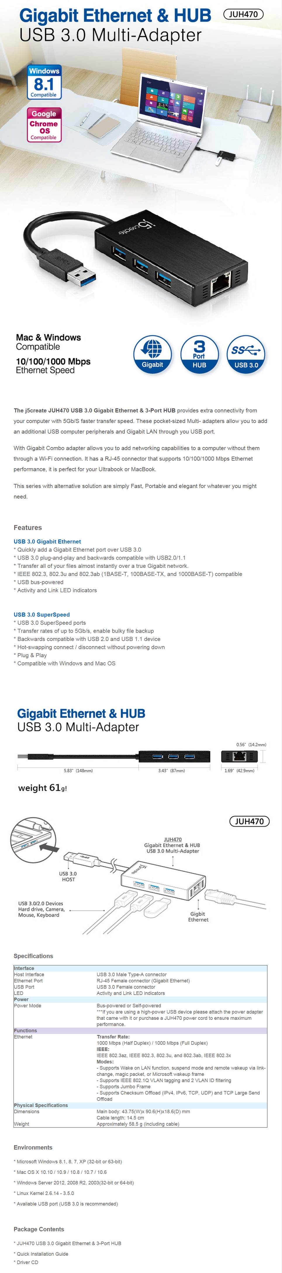 The j5create JUH470 USB 3.0 Gigabit Ethernet & 3-Port HUB provides extra connectivity from your computer with 5Gb/S faster transfer speed. These pocket-sized Multi- adapters allow you to add an additional USB computer peripherals and Gigabit LAN through you USB port.
