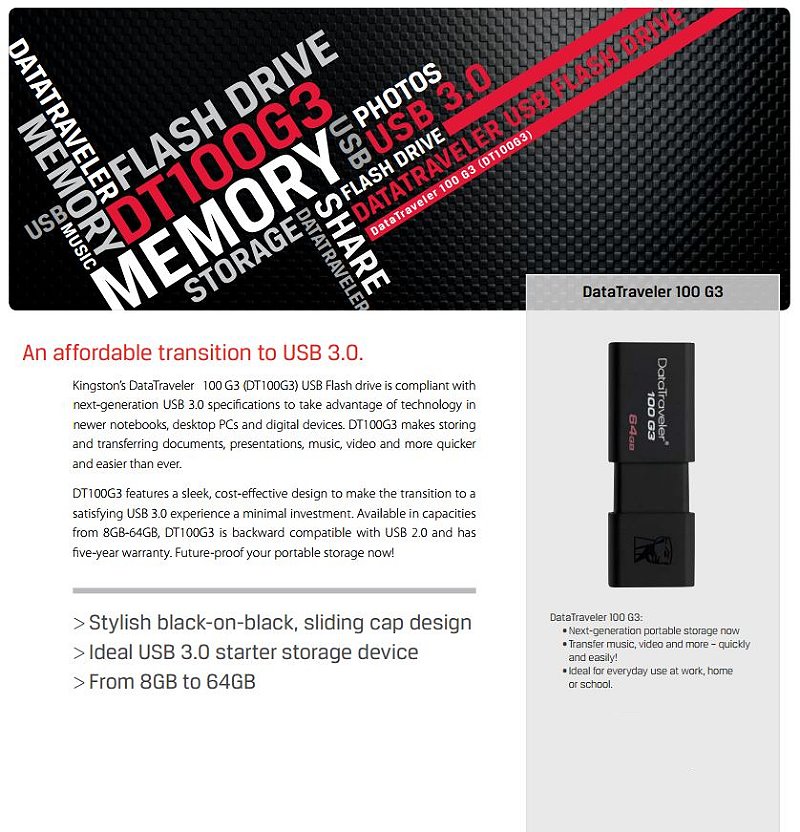 Product Name | Kingston DataTraveler 100 G3 64GB USB3 Flash Drive DT100G3/64GB |