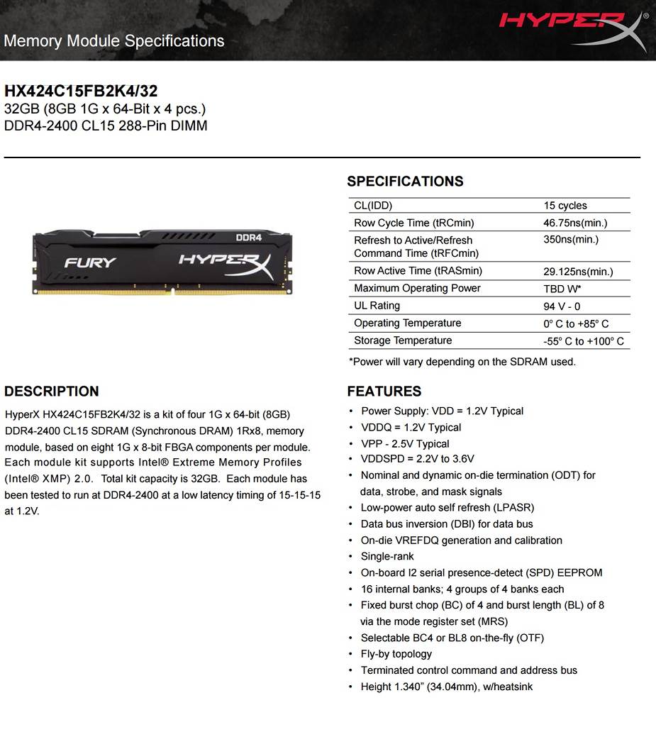 Product Name Kingston HX424C15FB2K4/32 32GB 2400MHz DDR4 CL15 (Kit of 4) HyperX FURY Black
