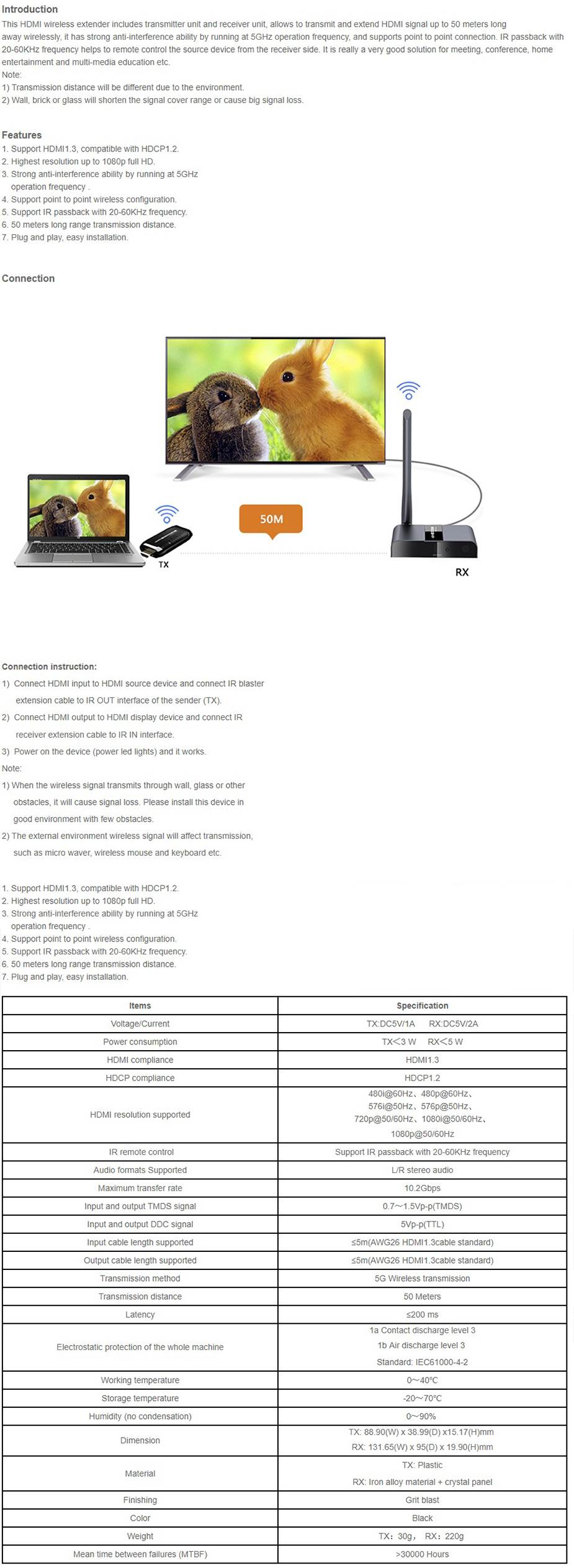 The Lenkeng LK-LKV388-Dongle, HDMI wireless extender allows the user to transmit and extend an HDMI signal up to 50 metres away wirelessly in an office or boardroom environment, it has a strong anti-interference ability by running at 5GHz operation frequency and supports point to point connection. IR passback with 20-60KHz frequency helps to remote control the source device from the receiver side. It is highly reliable and a perfect solution for meeting rooms, conference halls or auditoriums. Note: *Transmission distance will be different due to the environment **Wall, brick or glass will shorten the signal cover range or cause big signal loss