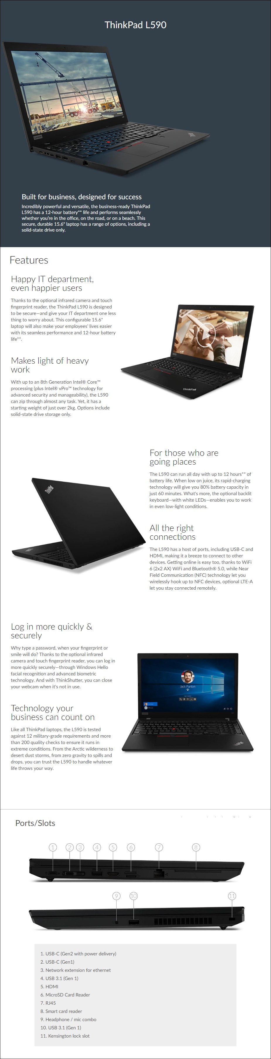 ThinkPad L590 20Q7S00R00 Laptop/Notebook - Display: 15.6" Full HD IPS Anti-Glare Display (1920 x 1080) - Graphics: Intel UHD Graphics 620 - CPU: Intel® Core™ i5-8265U Processor (6M Cache, up to 3.90GHz) - Memory: 16GB DDR4 Memory - Storage: 512GB PCIe NVME Opal SSD - Network: Intel® Dual Band Wireless-AC 9560 (2x2, 802.11ac) + Bluetooth - Fingerprint Reader - Windows 10 Pro - Ports: 2x USB-C (1x Gen 2 with PD), 2x USB 3.1 Gen 1, HDMI, RJ-45, MicroSD Card Reader - 12 Months Limited Warranty |
