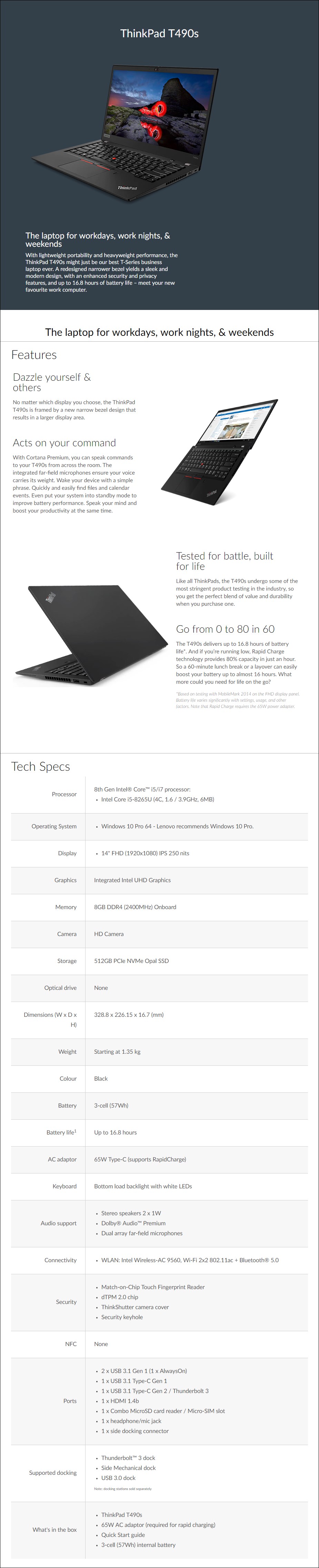 ThinkPad T490s 20NXS00V00 Notebook/Laptop - CPU: Intel® Core™ i5-8265U Processor (6M Cache, up to 3.90GHz) - Display: 14" Full HD IPS Display (1920 x 1080) - Memory: 8GB DDR4 2400 MHz - Storage: 512GB PCIe NVMe Opal SSD - Network: Intel® Dual Band Wireless-AC 9560 (2x2, 802.11ac) + Bluetooth 5.0 - Windows 10 Pro - Backlit Keyboard - Fingerprint Reader - 2x USB 3.1 Gen 1, USB-C 3.1 Gen 1, USB-C 3.1 Gen 2 (TB3), MicroSD Card Reader - 3 Years Limited Warranty