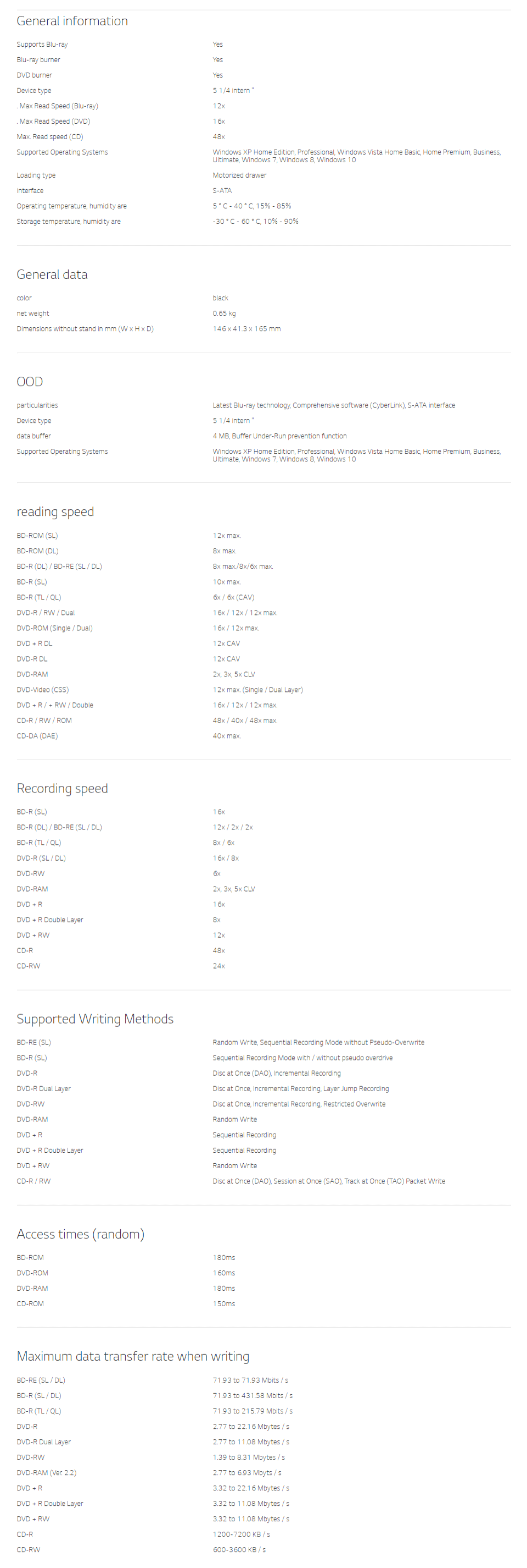 Product Name | LG BH16NS55 OEM WRITER Blu-ray & DVD 16x Super Multi Re-writer SATA Black |