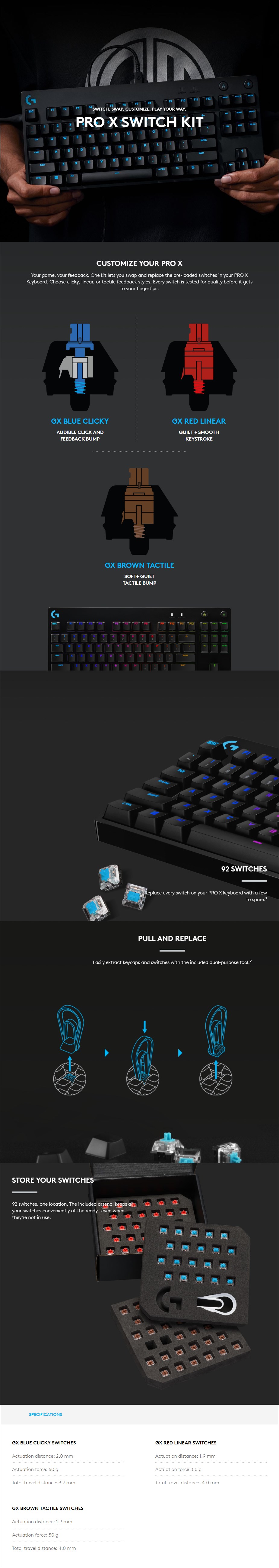 Logitech G Pro X 92-Key Mechanical Switch Kit - Tactile - Includes 92 Switches - Soft + Quiet Tactile Bump - Includes Dual-Purpose Keycap Puller Tool & Arsenal - Actuation distance: 1.9 mm - Actuation force: 50 g - Total travel distance: 4.0 mm - 943-000326 - 12 Months Limited Warranty |