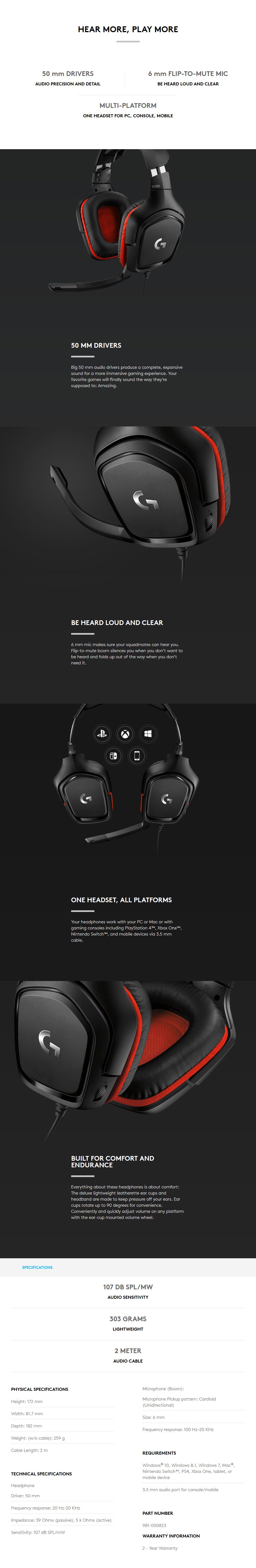 Logitech G332 Stereo Gaming Headset - 2m Cable - 50mm Drivers - Frequency Response: 20Hz - 20KHz - Impedance: 39 Ohms (Passive), 5k Ohms (Active) - Sensitivity: 107dB SPL/mW - Microphone: Cardioid (Unidirectional) Pickup Pattern, 100Hz-20KHz Frequency Response - Compatible with PC, PS4™, Nintendo Switch™ and Xbox One™ - 981-000823 - 2 Years Limited Warranty