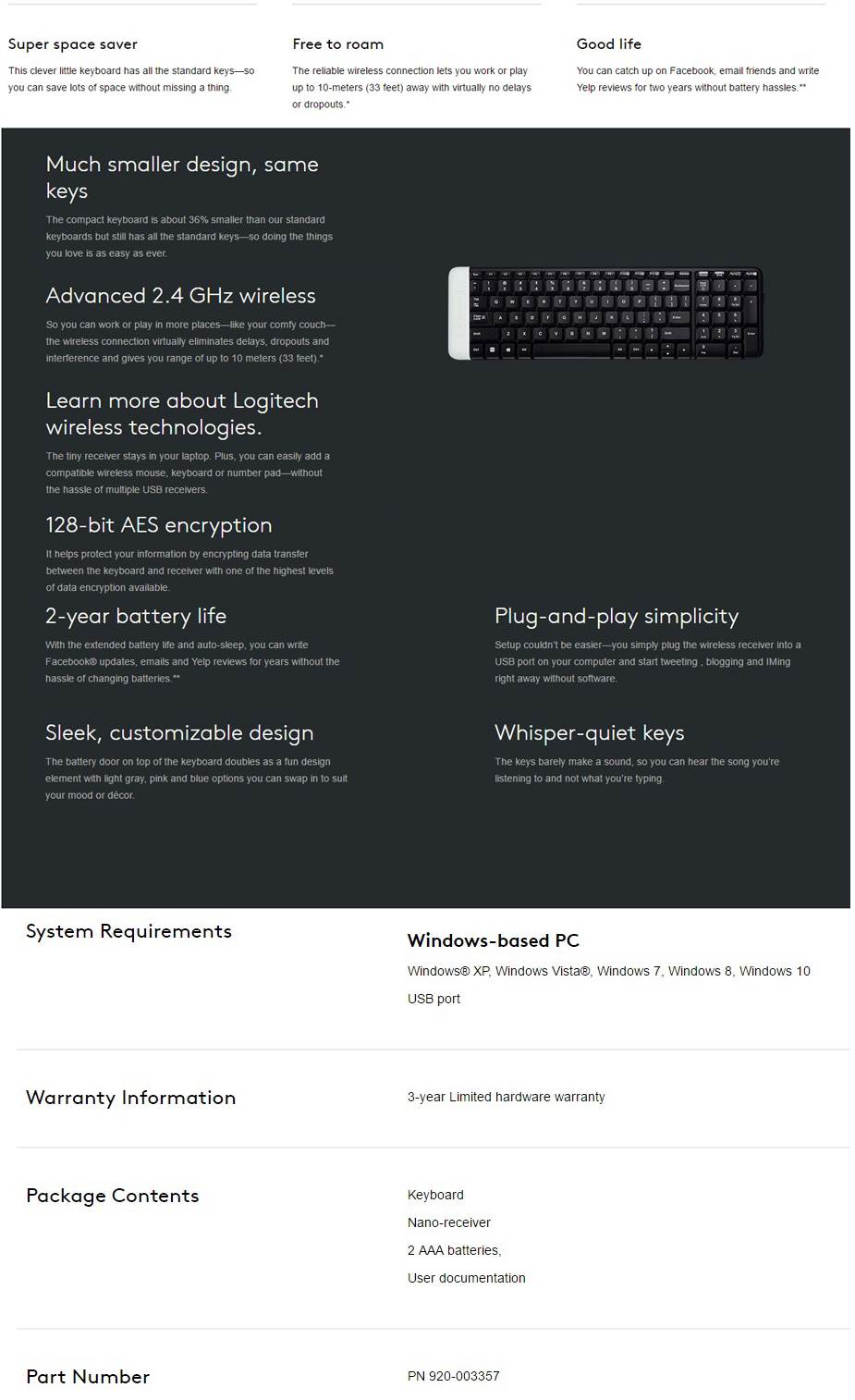 The compact keyboard that brings fun to the basics with all the standard keys; reliable, long-range wireless with the tiny, plug-and-forget Logitech Unifying receiver; and 2-year battery life.