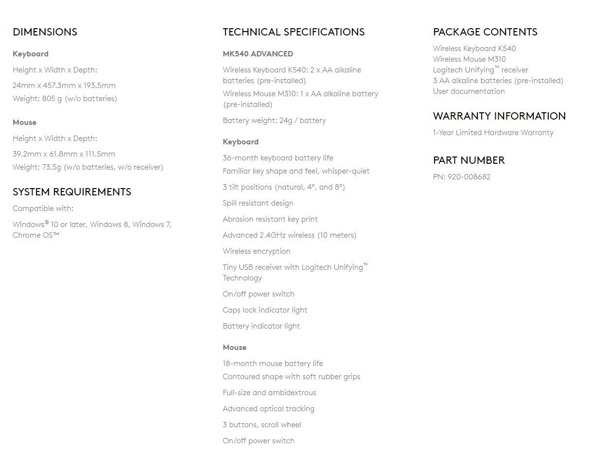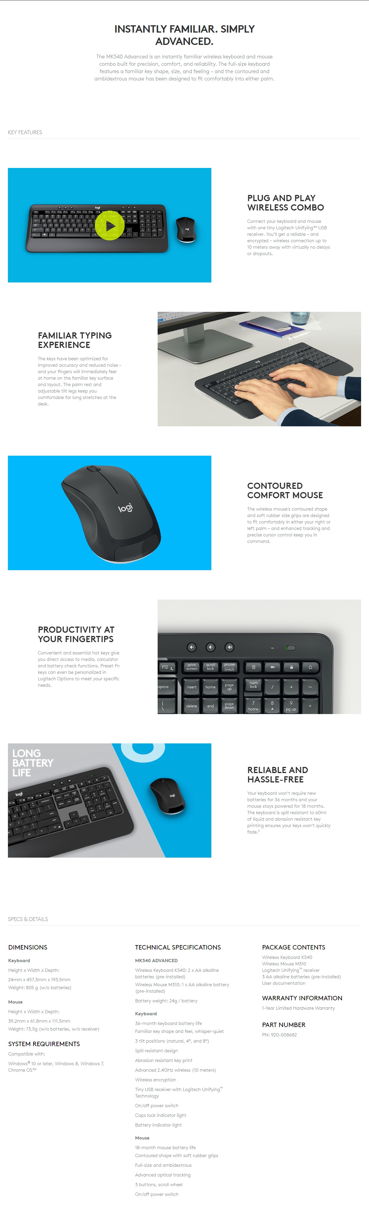 The MK540 Advanced is an instantly familiar wireless keyboard and mouse combo built for precision, comfort, and reliability. The full-size keyboard features a familiar key shape, size, and feeling – and the contoured and ambidextrous mouse has been designed to fit comfortably into either palm.