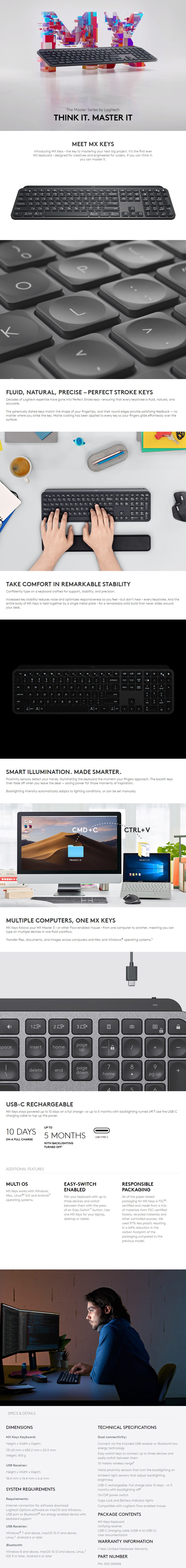 Logitech MX Keys Wireless Illuminated Keyboard - Black/Grey - Backlit Keys with ambient light and motion sensors - Wireless Connection: USB Receiver or Bluetooth - Charges via: USB-C to USB-A Cable (1x Included) - 920-009418 - 12 Months Limited Warranty