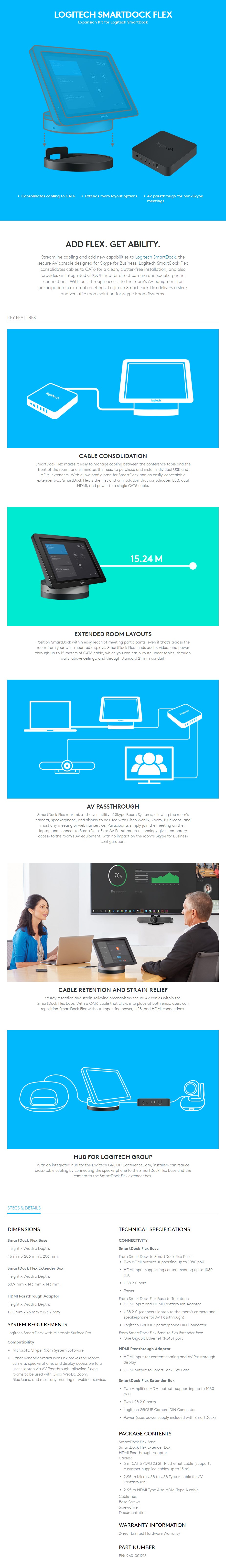 Logitech SmartDock Flex Expansion Kit - Consolidates cabling to CAT6 - Extends room layout options - AV passthrough for non-Skype meetings - Package Contents: SmartDock Flex Base, SmartDock Flex Extender Box, HDMI Passthrough Adaptor, Cables - Requirements: Logitech SmartDock with Microsoft Surface Pro - 960-001213 - 2 Years Limited Warranty