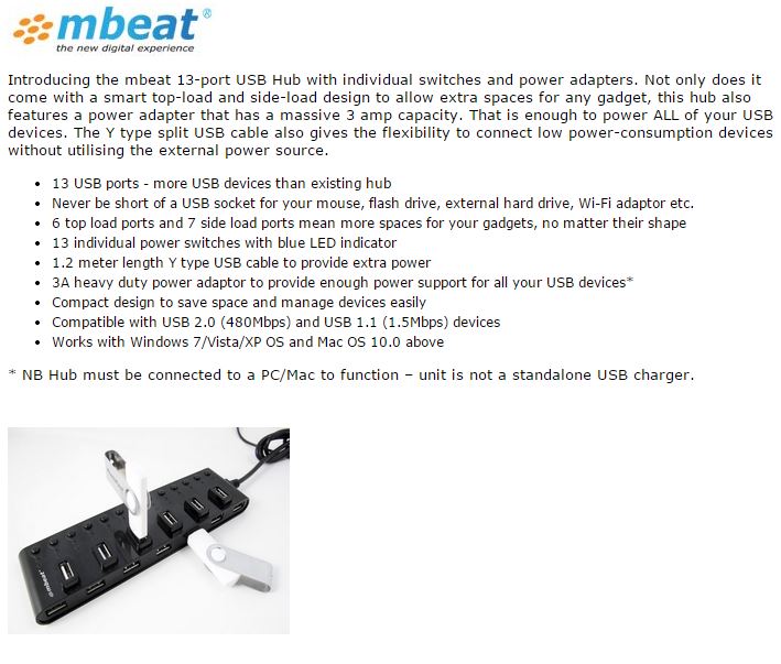 Product Name | Mbeat 13-Port USB 2.0 Hub Individual Power Switches And Adapter |