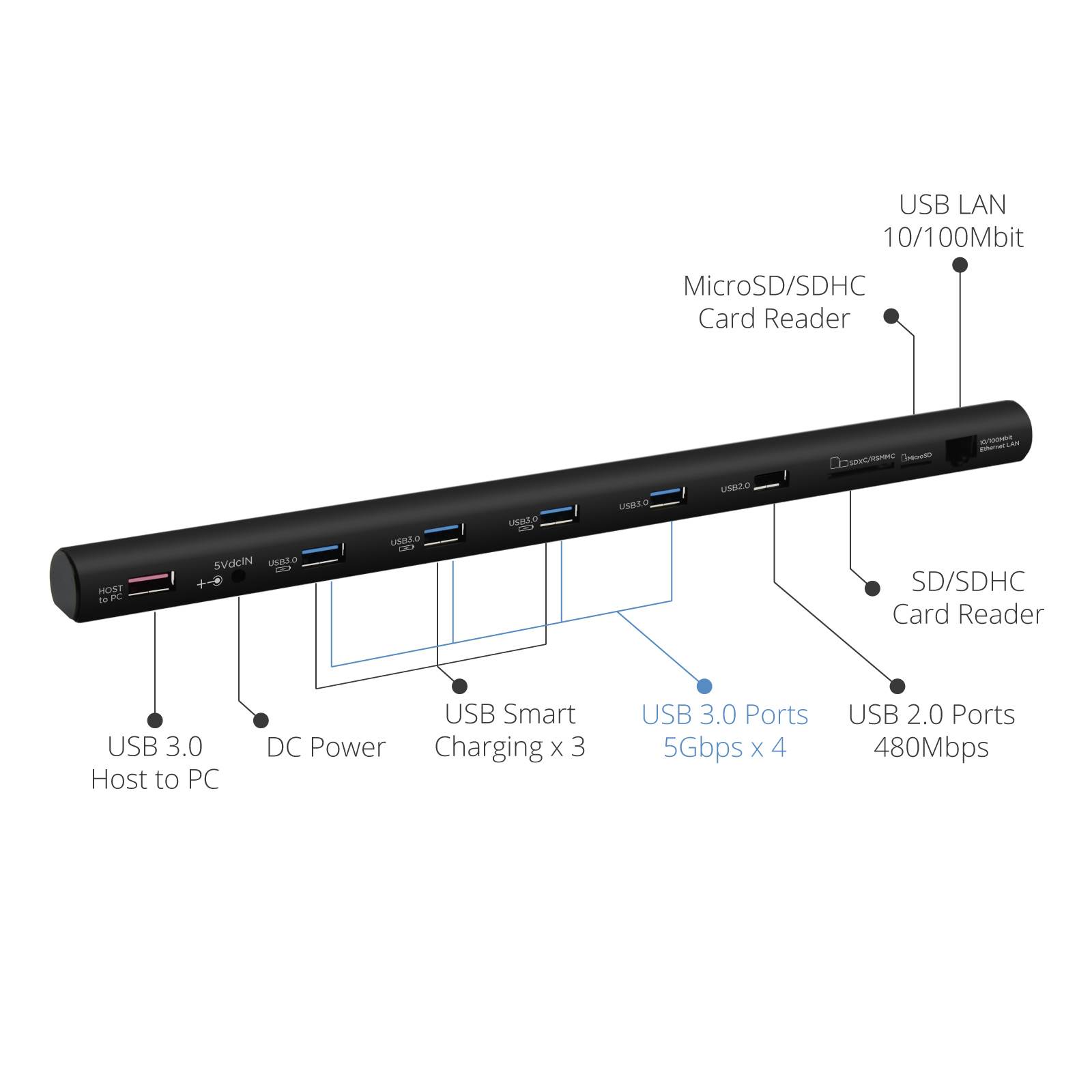Mbeat MB-MSDOCK M-Sleek Universal USB Docking Station - Silver - 4x USB 3.0 Ports - 3x Fast-charging Ports - 1x USB 2.0 Port - 1x SD Reader Card Slot - 1x MicroSD Reader Card Slot - USB LAN: RJ45 10/100Mbit to USB