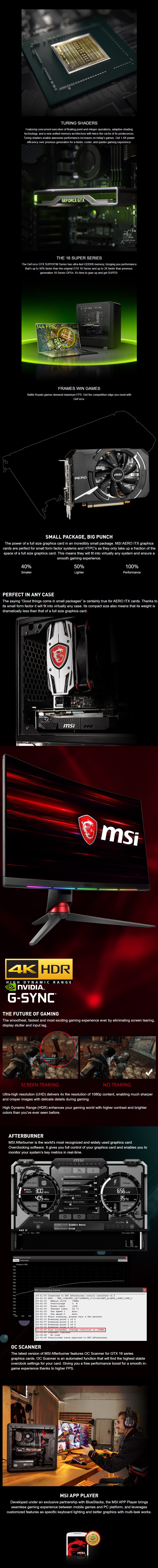 MSI GeForce GTX 1660 SUPER AERO ITX OC 6GB Video Card - Graphics Procesing: NVIDIA® GeForce® GTX 1660 SUPER - CUDA Cores: 1408 - Clock Clock: 1815 MHz (Boost) - Display Output: 1x DisplayPort v1.4, 1x HDMI 2.0b, 1x DL-DVI-D - Interface: PCI-e 3.0 - DirectX 12 - Recommended PSU: 450W - DirectX 12 - OpenGL 4.5 - HDCP 2.2 Support - MSI GeForce GTX 1660 Super Ventus XS OC 6G - 3 Years Limited Warranty