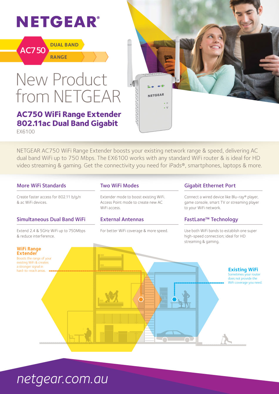The AC750 WiFi Range Extender (EX6100) boosts your existing home network by increasing WiFi range and speed, delivering 11ac dual band WiFi up to 750 Mbps It works with any router and provides WiFi for HD video streaming and gaming even in remote places of your home. Get the connectivity you need for iPads®, smartphones, laptops and more.