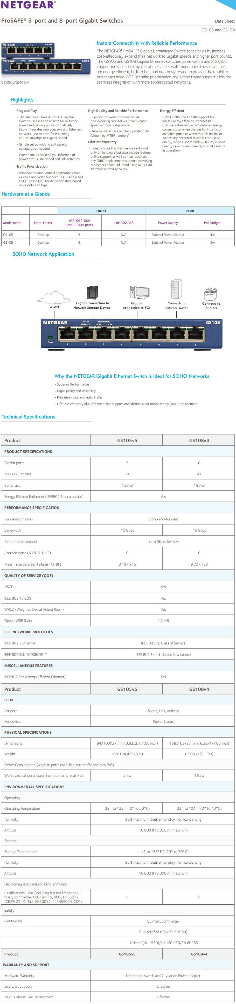 The NETGEAR ProSAFE® Gigabit Unmanaged Switch series helps businesses cost-effectively expand their network to Gigabit speeds and higher port counts. These unmanaged Gigabit switches come in a wide range of models including desktop and rackmount form factors and 5 to 24 port configurations. The GS108P supports PoE for low-cost PoE solution. These switches are energy efficient, built to last, and rigorously tested to provide the reliability businesses need. 802.1p traffic prioritization and jumbo frame support allow for seamless integration with more sophisticated networks.