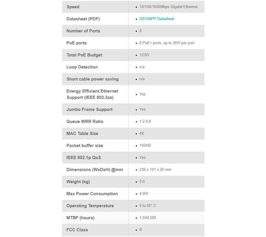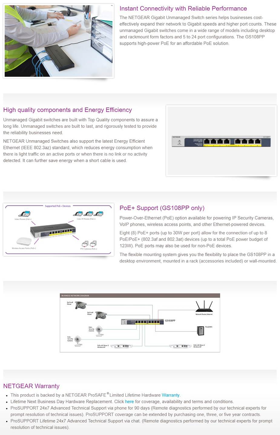 Product Name | Netgear GS108PP ProSAFE 8 port POE/POE+ Gigabit Ethernet Unmanaged Switch |