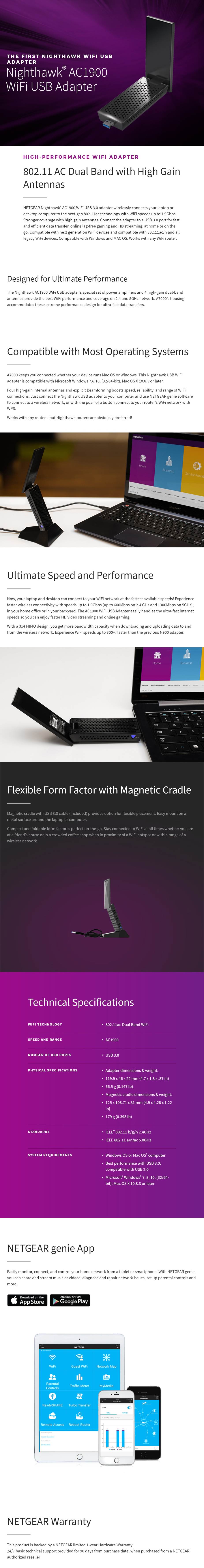 Description Netgear "nighthawk" Ac1900 Wifi Usb Adapter Usb 3.0 Dual Band (a7000)
