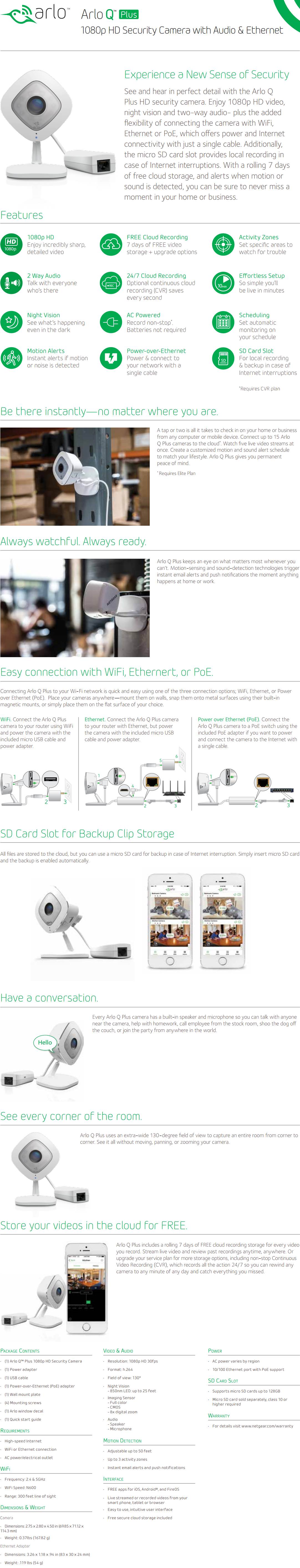 Product Name Netgear VMC3040S Arlo Q Plus 1080p HD H.264 Wireless Security Camera Audio/Ethernet/PoE