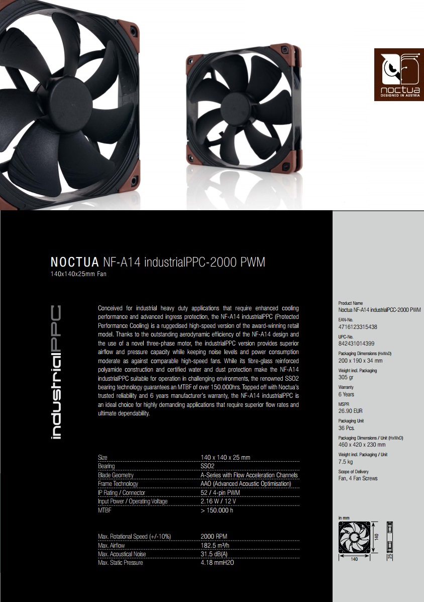 Product Name | Noctua 140mm NF-A14 Industrial PPC IP52 2000RPM Fan |