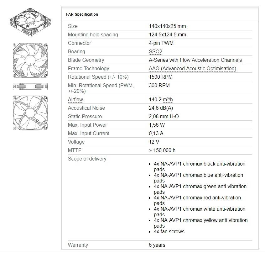 6-year manufacturer’s warranty Noctua fans are renowned for their impeccable quality and outstanding longevity. Like all Noctua fans, the chromax edition models feature an MTBF of more than 150,000 hours rating and come with a full 6-year manufacturer's warranty.