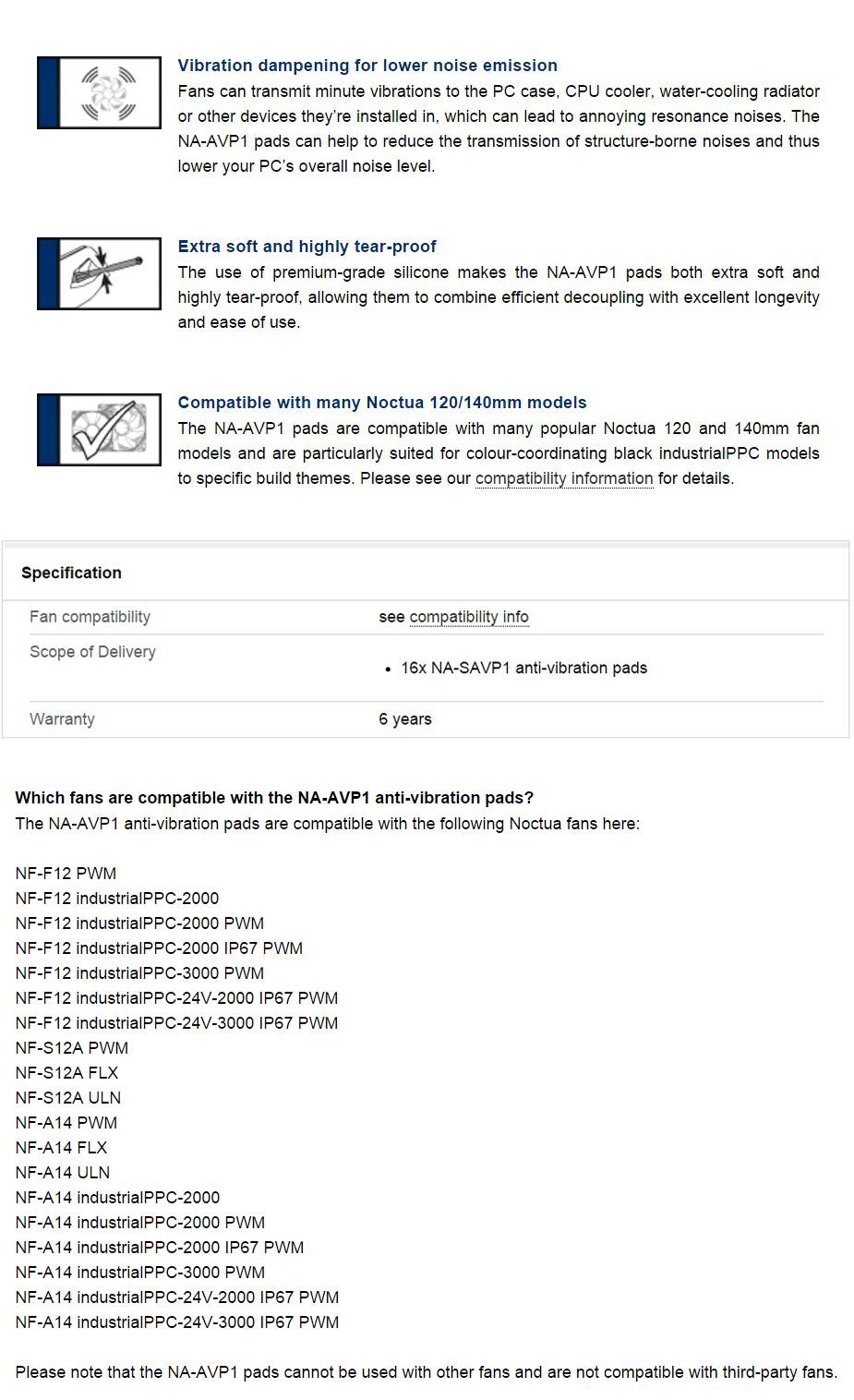 Noctua NA-SAVP1 Chromax.Black Anti-Vibration Mounting Pads (16-Pack) - Black - Vibration dampening for lower noise emission - Full compatibility with standard fan screws and most other mounting systems - Extra soft and highly tear proof - Compatible with most Noctua 120/140mm fan models - Please note that the NA-AVP1 pads cannot be used with other fans and are not compatible with third-party fans - 6 Year Limited Warranty