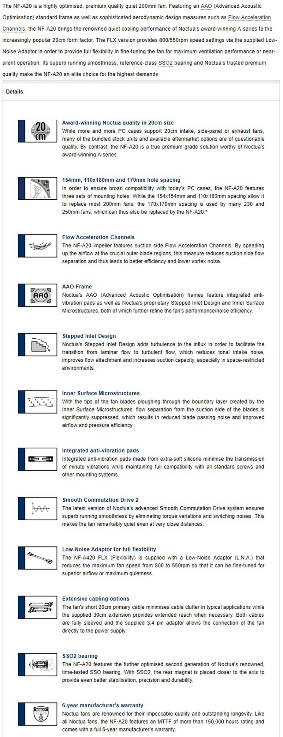 Manufacturer: Noctua. The NF-A20 is a highly optimised, premium quality quiet 200mm fan. Featuring an AAO (Advanced Acoustic Optimisation) standard frame as well as sophisticated aerodynamic design measures such as Flow Acceleration Channels, the NF-A20 brings the renowned quiet cooling performance of Noctuas award-winning A-series to the increasingly popular 20cm form factor. The FLX version provides 800/550rpm speed settings via the supplied Low-Noise Adaptor in order to provide full flexibility in fine-tuning the fan for maximum ventilation performance or near-silent operation. Its superb running smoothness, reference-class SSO2 bearing and Noctuas trusted premium quality make the NF-A20 an elite choice for the highest demands.
