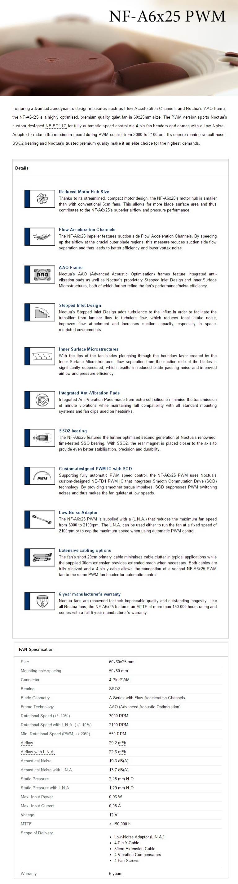 Featuring advanced aerodynamic design measures such as Flow Acceleration Channels and Noctuas AAO frame, the NF-A6x25 PWM is a highly optimised, premium quality quiet fan in 60x25mm size. Smooth Commutation Drive technology and Noctuas reference class SSO2 bearings guarantee superb running smoothness and excellent long term stability. Topped off with modular cabling, low noise adaptors and 6 years manufacturers warranty, the NF-A6x25 is a premium choice for the highest demands.