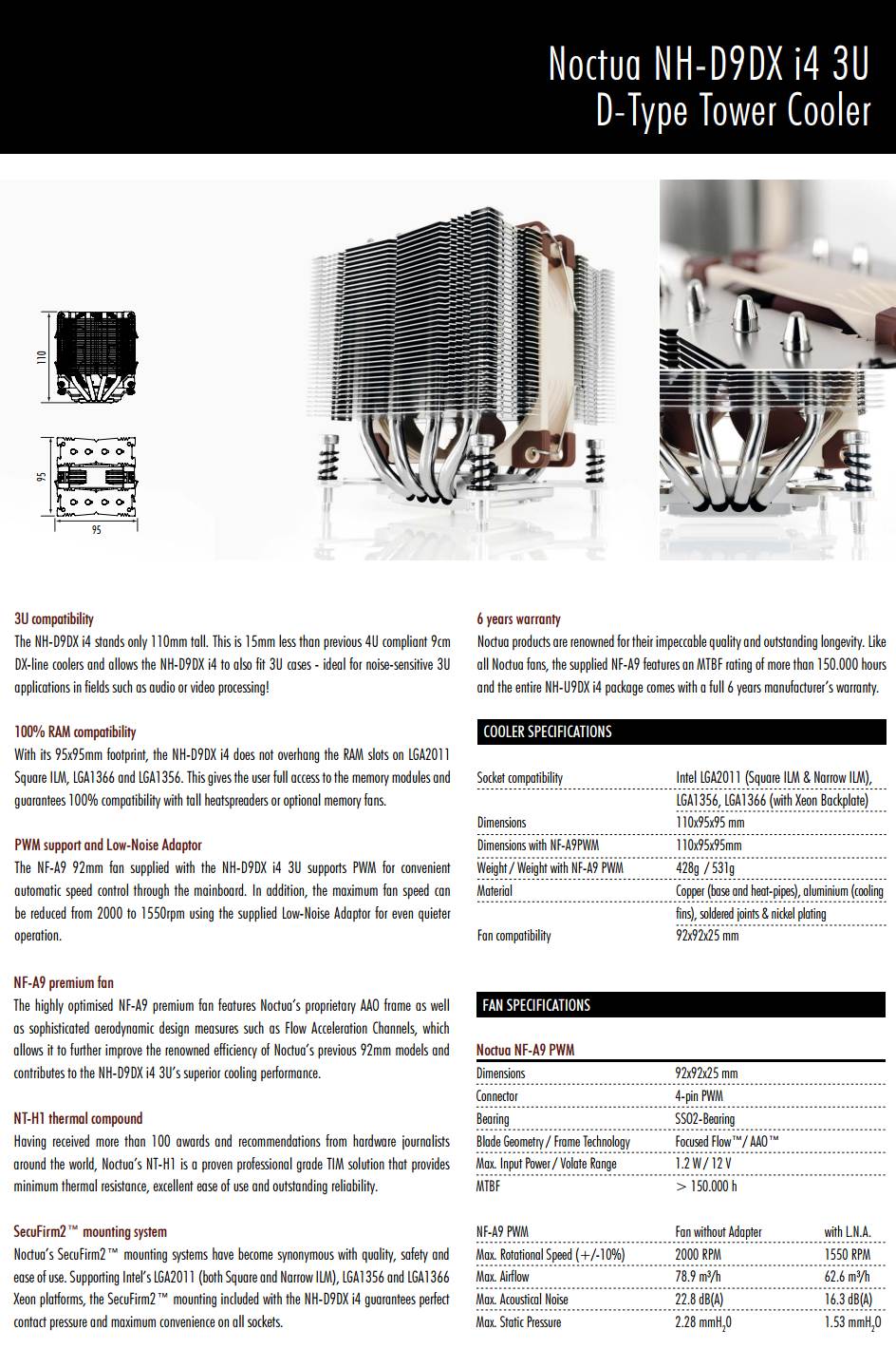 Noctua NH-D9DX i4 3U CPU Cooler - 92mm Noctua NF-A9 PWM fan - Intel LGA2011, LGA1356, LGA1366 (with Xeon Backplate) - 22.8 dB(A) fan noise - 78.9 m³/h mas fan air flow - 6 years warranty