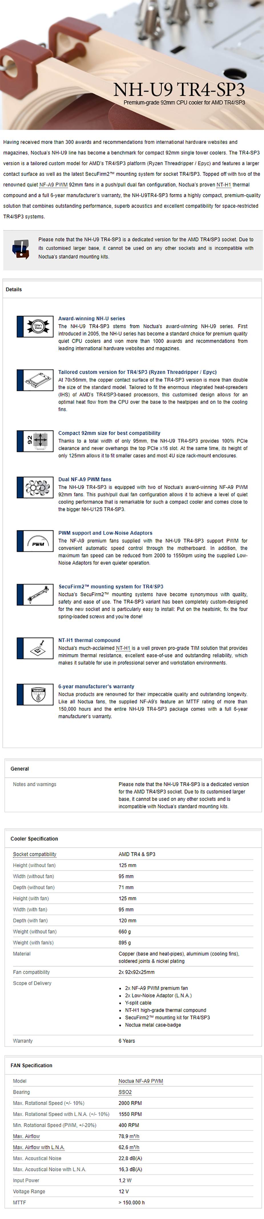 Manufacturer: Noctua. Having received more than 300 awards and recommendations from international hardware websites and magazines, Noctuas NH-U9 line has become a benchmark for compact 92mm single tower coolers. The TR4-SP3 version is a tailored custom model for AMDs TR4/SP3 platform (Ryzen Threadripper/Epyc) and features a larger contact surface as well as the latest SecuFirm2 mounting system for socket TR4/SP3. Topped off with two of the renowned quiet NF-A9 PWM 92mm fans in a push/pull dual fan configuration, Noctuas proven NT-H1 thermal compound and a full 6-year manufacturers warranty, the NH-U9 TR4-SP3 forms a highly compact, premium-quality solution that combines outstanding performance, superb acoustics and excellent compatibility for space-restricted TR4/SP3 systems.