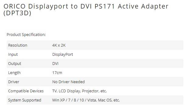 Orico DPT3D Displayport to DVI PS171 Active Adapter