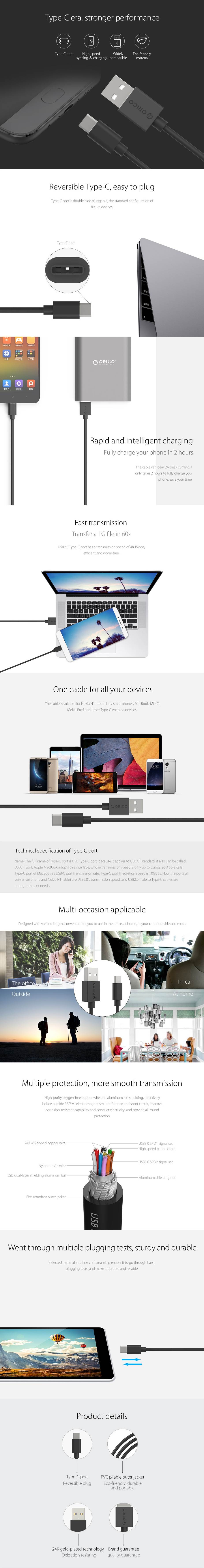 Orico Ecu-10-bk 1m Usb2 To Type-c Charging & Data Cable Black