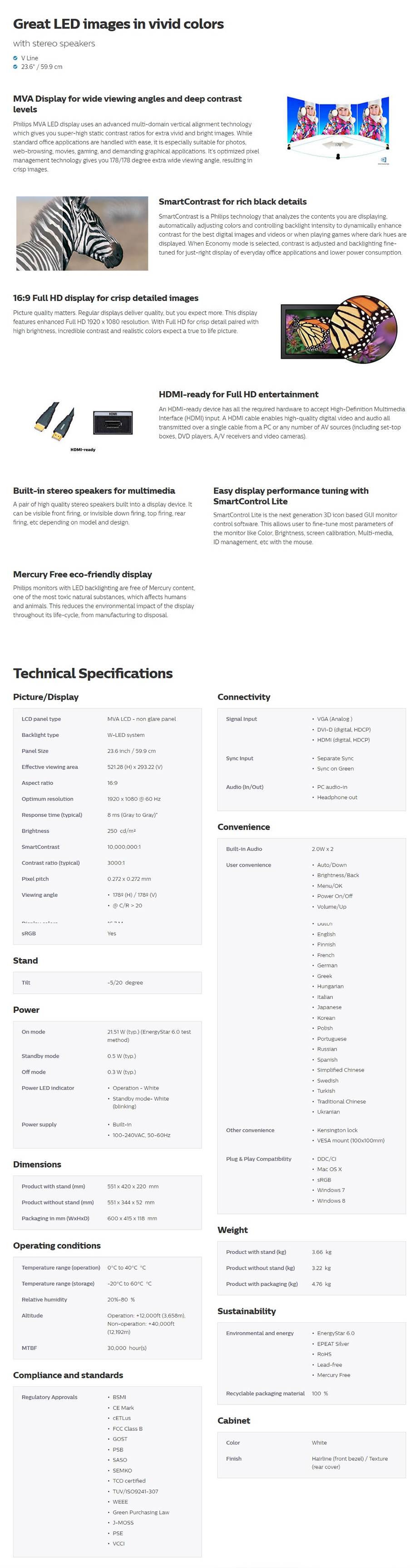 Philips 243v5qhawa 23.6in 243v5qhawa Led Fhd 1920x1080 8ms