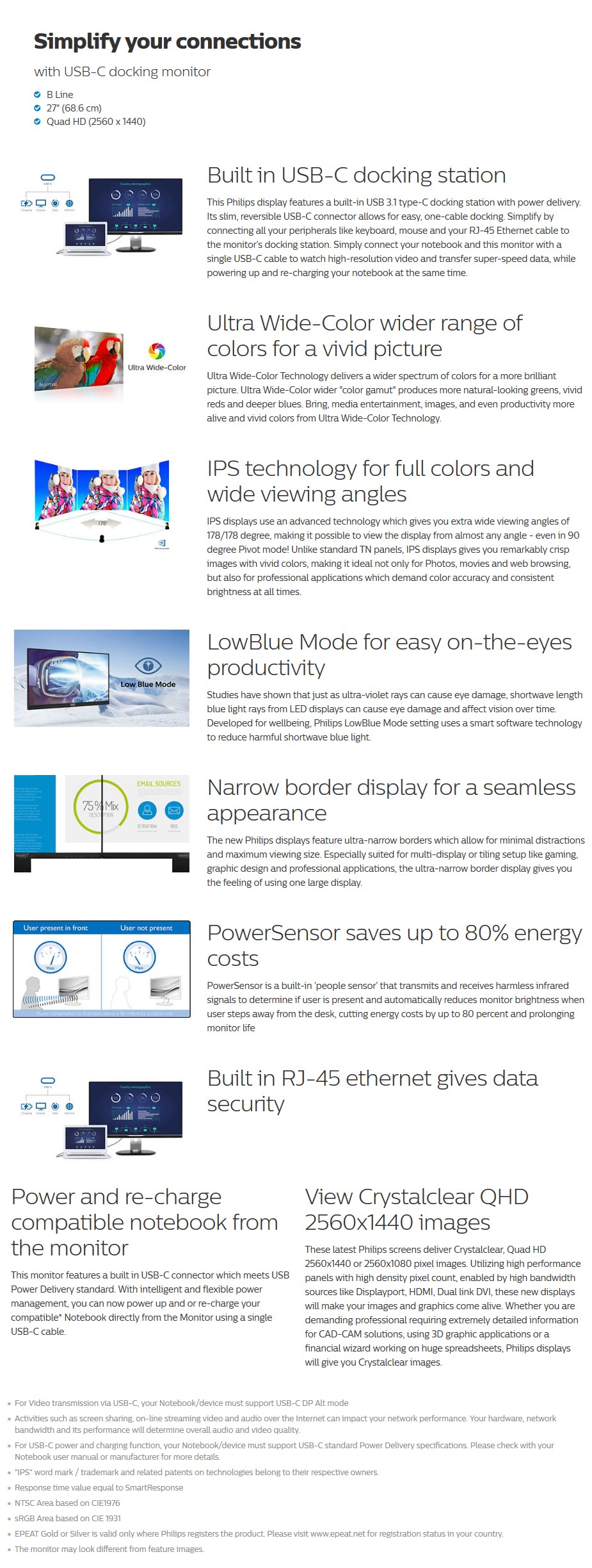 Philips 272B7QUPBEB 27" QHD USB-C IPS LCD Monitor - Panel Size: 27" - Native Resolution: QHD (2560x1440) - Refresh Rate: 60Hz - Response Time: 5ms GtG - Native Aspect Ratio: 16:9 - Brightness: 350 cd/m2 - Contrast Ratio: 1,000:1 (typ), 50,000,000:1 (SmartContrast) - Flicker-Free - 16.7 Million Displayable Colours (8-Bit) - Height, Pivot, Swivel & Tilt Adjustable - Built in 2 W x 2 Speakers - Signal Input: 1x DisplayPort 1.2, HDMI 1.4 - USB-C 3.1 Gen 2 - 4 Years Limited Warranty