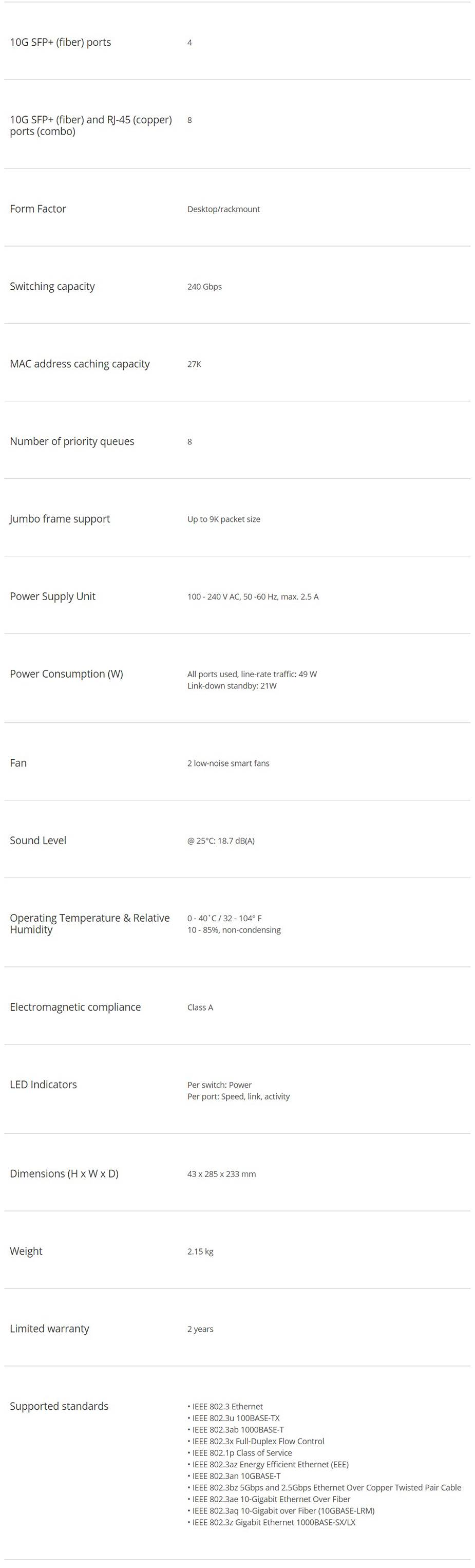 QSW-1208-8C: Twelve 10GbE SFP+ ports with shared eight 10GBASE-T ports unmanage switch, NBASE-T support for 5-speed auto negotiation (10G/5G/2.5G/1G/100M)
