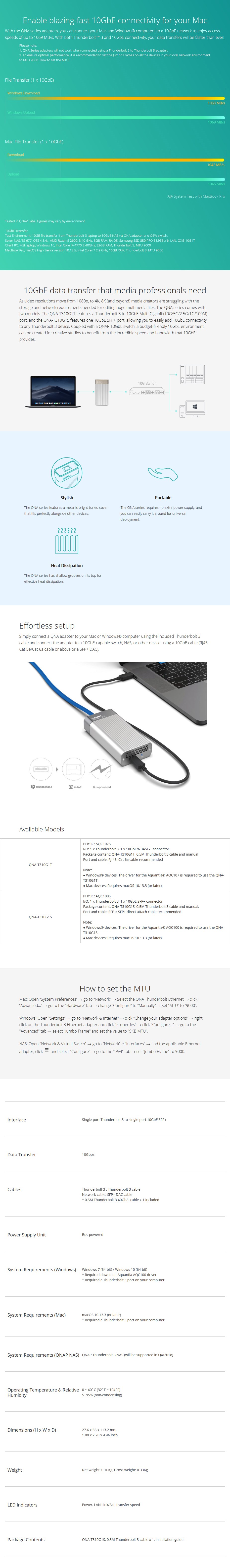 QNAP Thunderbolt 3 to 10GBase-T Network Adapter - Single-port Thunderbolt 3 to Single-port 10GbE NBASE-T RJ-45 - Data Transfer Rate: 10Gbps/5Gbps/2.5Gbps/1Gbps/100Mbps - Power, LAN Link/Act, Transfer Speed Bus LED Indicators - Bus Powered - Compatible with QNAP Thunderbolt 3 Capable NAS - System Requirements: Windows 7/10 (64-bit), macOS 10.13.3 or later - QNA-T310G1T - 2 Years Limited Warranty