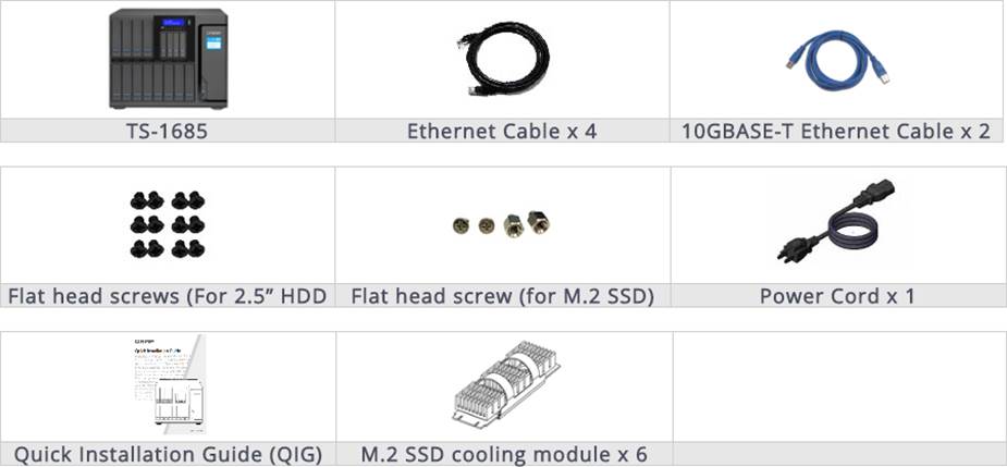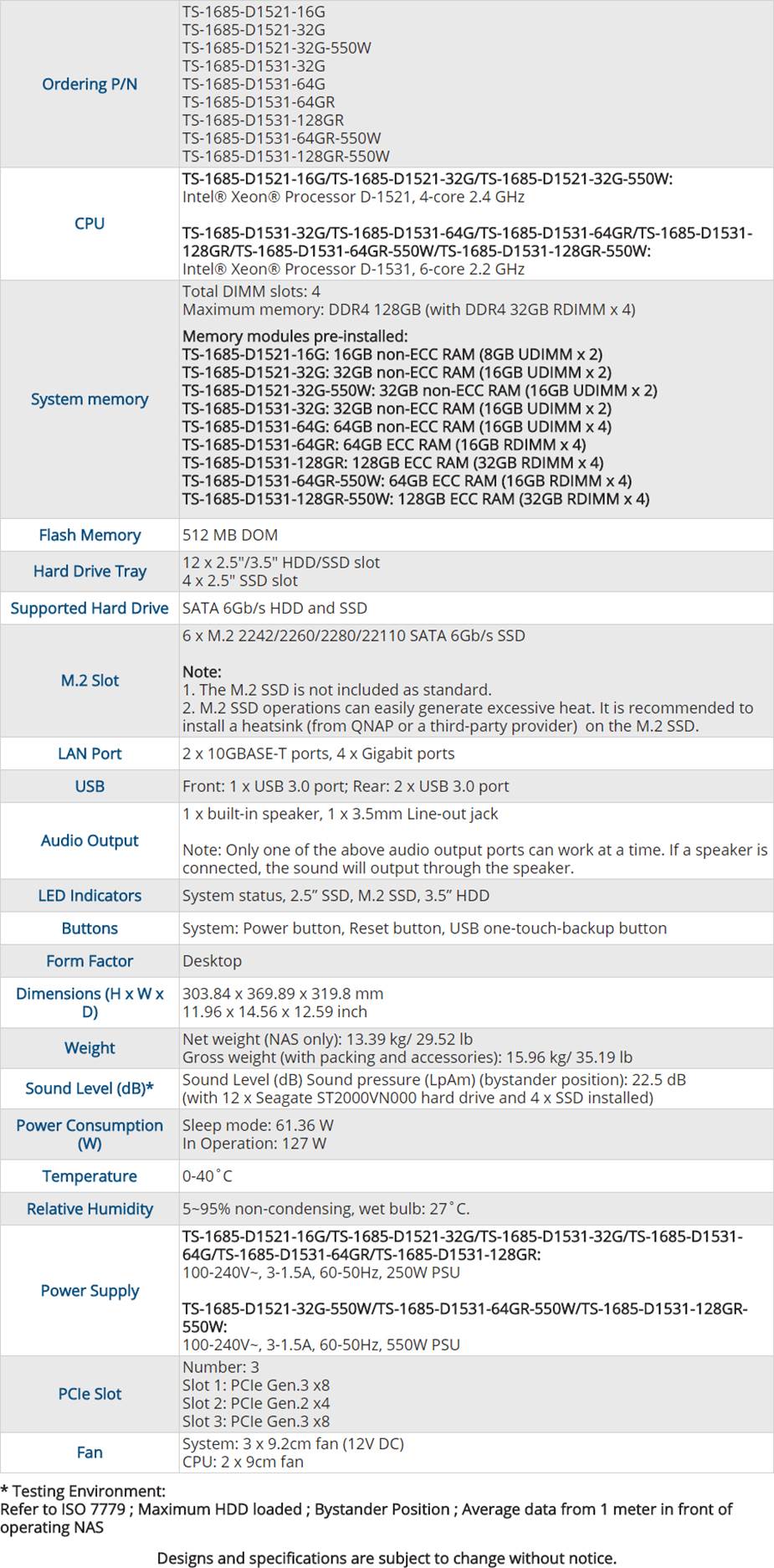 Supporting up to twelve 3.5" HDDs and four 2.5" SSDs, the TS-1685 is a high-capacity, robust, and reliable business NAS powered by an Intel® Xeon® D processor. Designed to optimize enterprise IT infrastructure, the TS-1685 comes with three PCIe slots that support 10GbE/40GbE NIC, PCIe NVMe SSD, graphics cards, and USB 3.1 expansion cards. Incorporating security and scalability, the TS-1685 presents an ideal choice for a complete business-ready storage solution with cross-platform file sharing, comprehensive backup and disaster recovery, iSCSI & virtualization, and more business applications.•NAS and iSCSI-SAN unified storage solution•Built-in M.2 SATA 6Gb/s slots & 2.5” SSD slots•Qtier technology and SSD caching enable 24/7 optimized storage efficiency•10GbE/40GbE-ready, highly-efficient storage solution for virtualization and intensive data transmission•Supports virtualization, containerized apps, centralized storage, backup, sharing, and disaster recovery•Q’center for centrally managing all of your NAS devices, and QRM+ as a centralized management solution for networked computing devices•Qfiling enabling automated file organization, Qsirch full-text search engine, and QmailAgent for centralized email management•Scalable up to 56 drive capacity with QNAP expansion enclosures