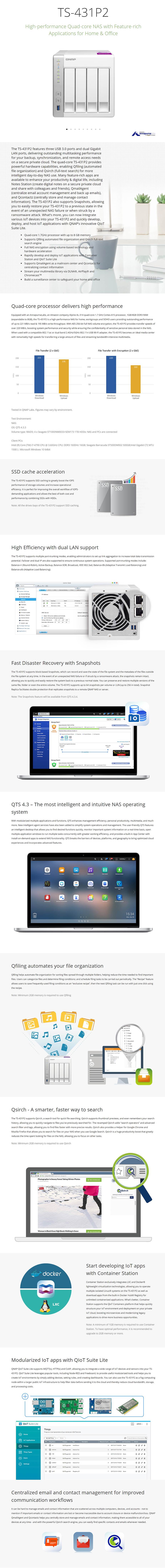 Product Name | QNAP TS-431P2-1G 4 Bay Diskless NAS Alpine AL-314 Quad Core 1.7GHz CPU 1GB RAM |