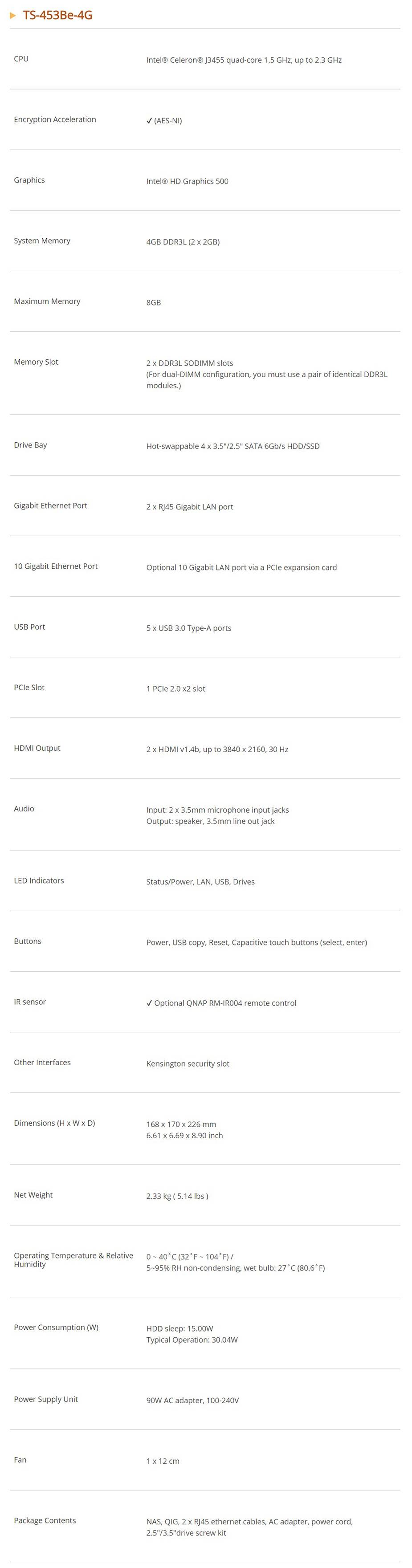 Description Qnap Ts-453be-4g Ts-453be-4g 4-bay Nas, Intel Celeron Apollo Lake J3455 Quad-core 1.5ghz (up To 2.3ghz), 4gb Ddr3l Sodimm Ram ( 1x4gb, Max 8gb Total), 2y Ar Wty