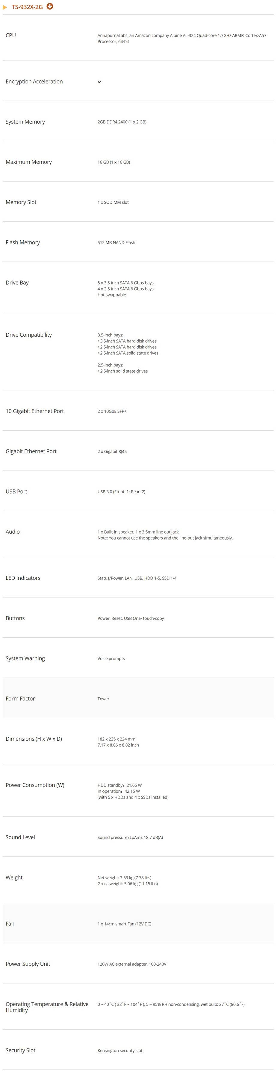 The business-class TS-932X is a budget-friendly NAS designed to accommodate five 3.5-inch hard drives and four 2.5-inch SSDs. It is also the first ARM-based NAS that supports Qtier™ technology for efficient auto-tiered storage. As a 9-bay NAS, the compact TS-932X takes up less desktop space compared with other models in the same class, and presents a stylish control panel embellished with brushed-metal aluminum. Featuring dual 10GbE SFP+ ports, the TS-932X provides an excellent blend of speed and affordability to future-proof your IT infrastructure for 10GbE networks.