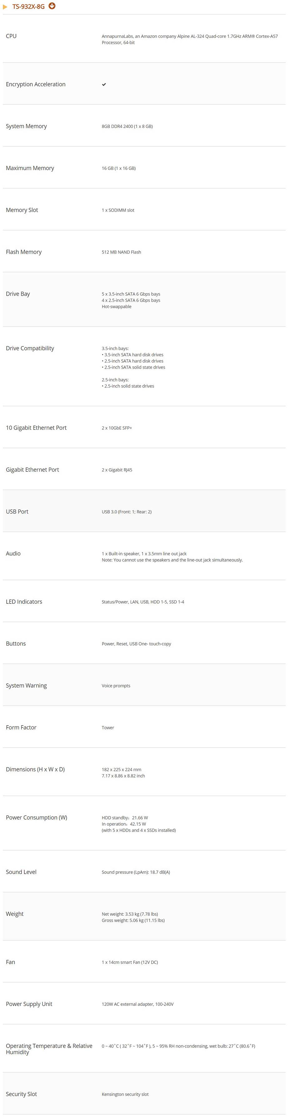 The business-class TS-932X is a budget-friendly NAS designed to accommodate five 3.5-inch hard drives and four 2.5-inch SSDs. It is also the first ARM-based NAS that supports Qtier™ technology for efficient auto-tiered storage. As a 9-bay NAS, the compact TS-932X takes up less desktop space compared with other models in the same class, and presents a stylish control panel embellished with brushed-metal aluminum. Featuring dual 10GbE SFP+ ports, the TS-932X provides an excellent blend of speed and affordability to future-proof your IT infrastructure for 10GbE networks.