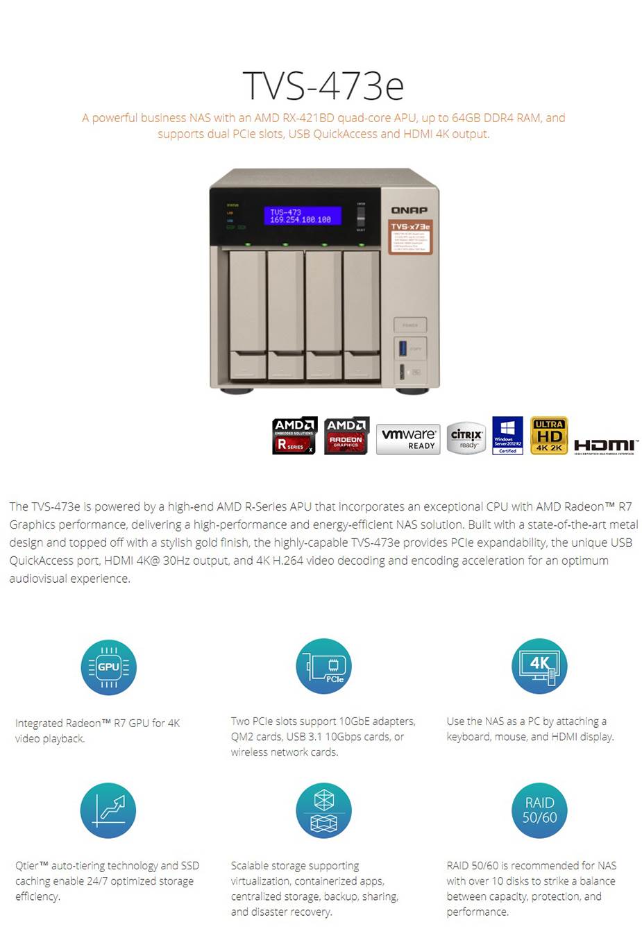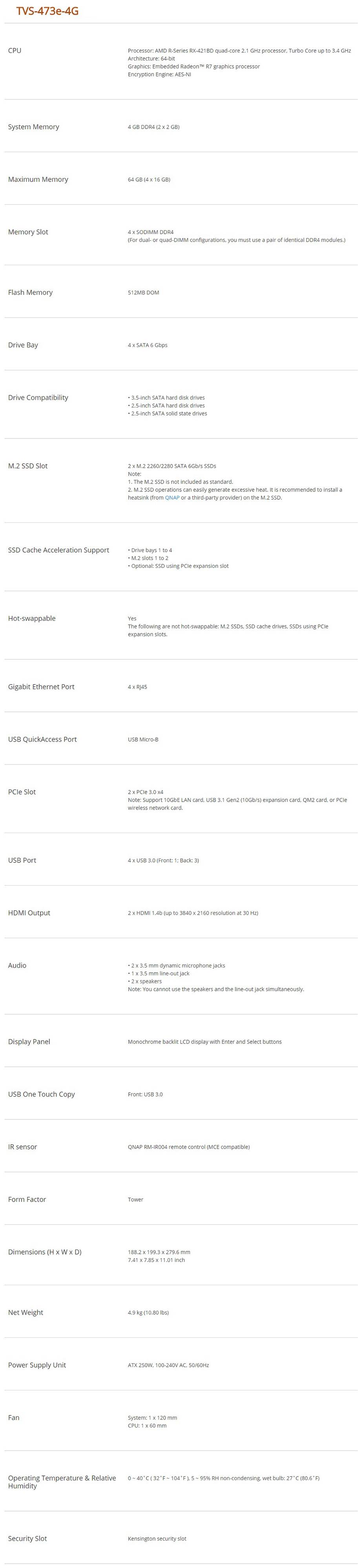 Product Name | QNAP TVS-473e-4G 4 Bay Diskless NAS - AMD APU 4GB DDR4 4K HDMI |