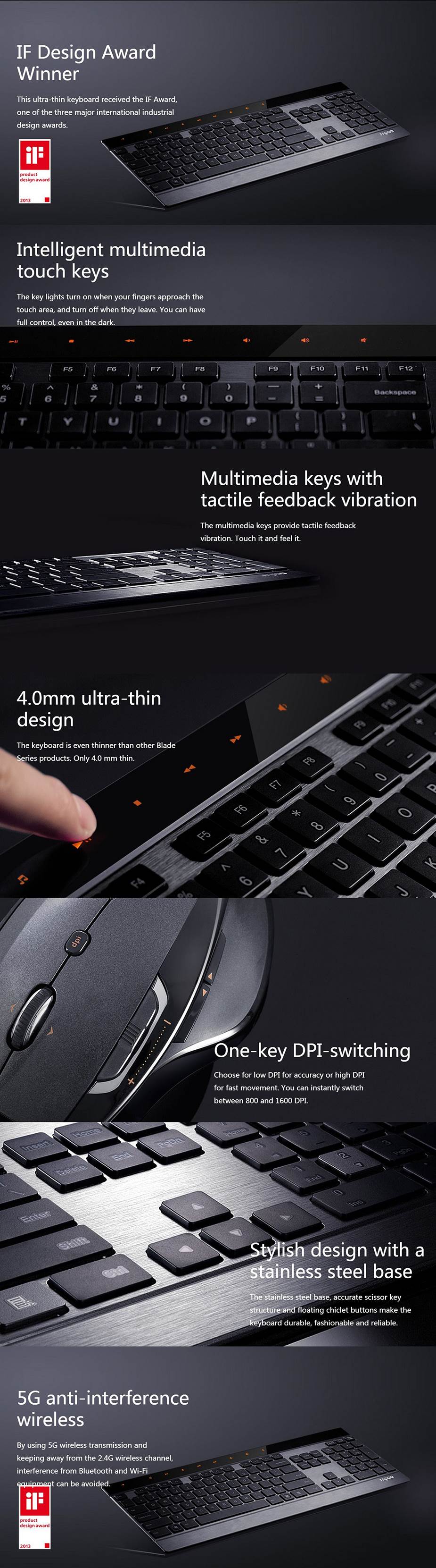 Rapoo 8900P Advanced Wireless Mouse & Keyboard - Intelligent multimedia touch keys - 4.0mm ultra-thin design - Multimedia keys with tactile feedback vibration - 12 Months Limited Warranty |