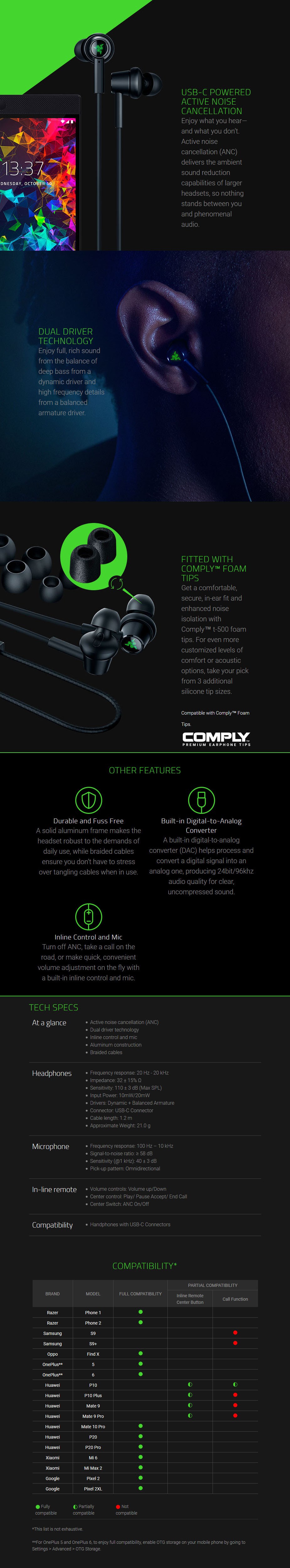 Razer Hammerhead USB-C ANC In-Ear Headphones - 20Hz - Frequency Response: 20Hz - 20KHz (Headphones), 100Hz – 10kHz (Microphone) - Omnidirectional Microphone Pick-up Pattern - Active Noise Cancellation - Dual Driver Technology - Built-in Digital-to-Analog Converter - Braided Cables - Inline Control and Mic - Comply t-500 Foam Tips - RZ12-02780100-R3M1 - 2 Years Limited Warranty