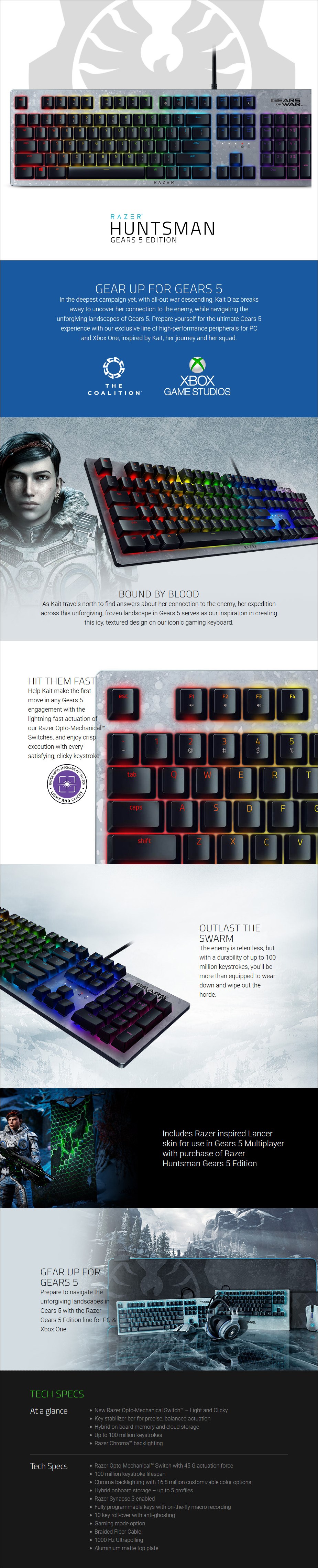 Razer Huntsman Opto-Mechanical Gaming Keyboard - Gears 5 Edition - Full Sized Gaming Keyboard - Razer Opto-Mechanical Switches - Up to 100 Million Keystrokes - Razer Chroma Backlighting - Hybrid On-Board Storage - Razer Synapse 3 Enabled - 10-Key Roll-Over (Anti-Ghosting) - Braided Fiber USB Cable - 100hz Ultra Polling - Aluminium Matte Top Plate - Fully Programmable Keys - On-The-Fly Macros - RZ03-02522000-R3M1 - 2 Years Limited Warranty