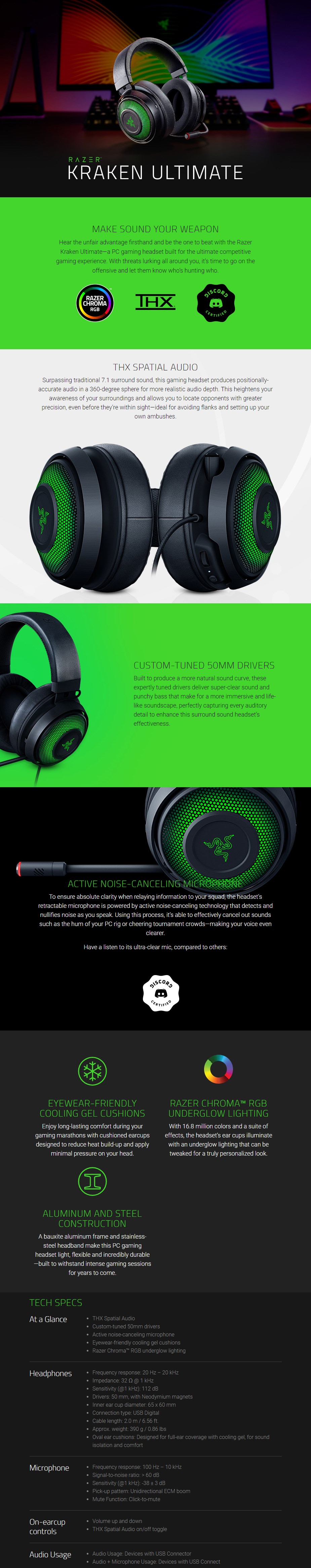 Razer Kraken Ultimate USB Surround Sound Chroma Gaming Headset - Black - THX Spatial Audio - Tuned 50mm Drivers - Active Noise Cancelling Microphone - Headphone Specs: Freq Response: 20Hz ~ 20Khz, Impedance: 32 Ohms @ 1 kHz, Connection: USB Digital - Microphone Specs: Freq Response: 100Hz – 10kHz, Unidirectional ECM Boom Pattern, Signal-to-noise ratio: >60 dB, Sensitivity (@1 kHz): -38 ± 3 dB - RZ04-03180100-R3M1 - 2 Years Limited Warranty