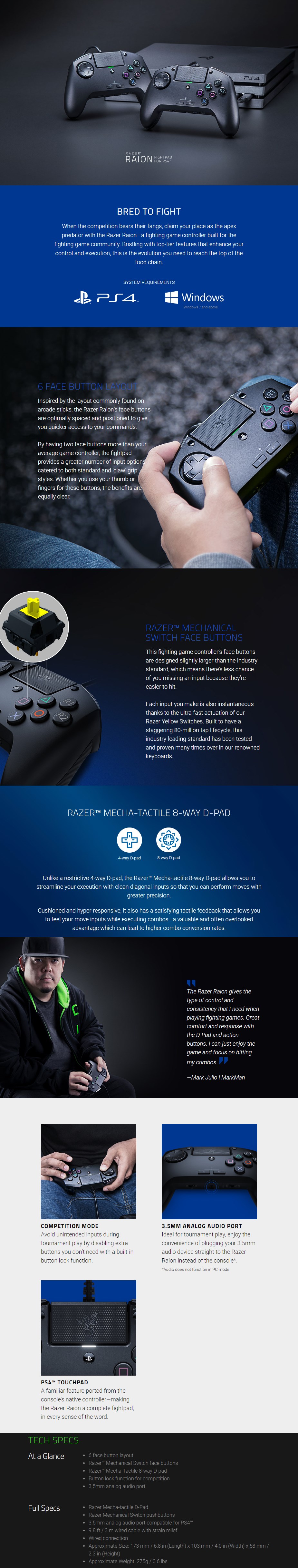 Razer Raion Fightpad Controller for PS4 - 6 face button layout - Razer Mechanical Switch face buttons - Razer Mecha-Tactile 8-way D-pad - Button lock function for competition - 3.5mm analog audio port - 3M Wired Cable - RZ06-02940100-R3A1 - 2 Years Limited Warranty